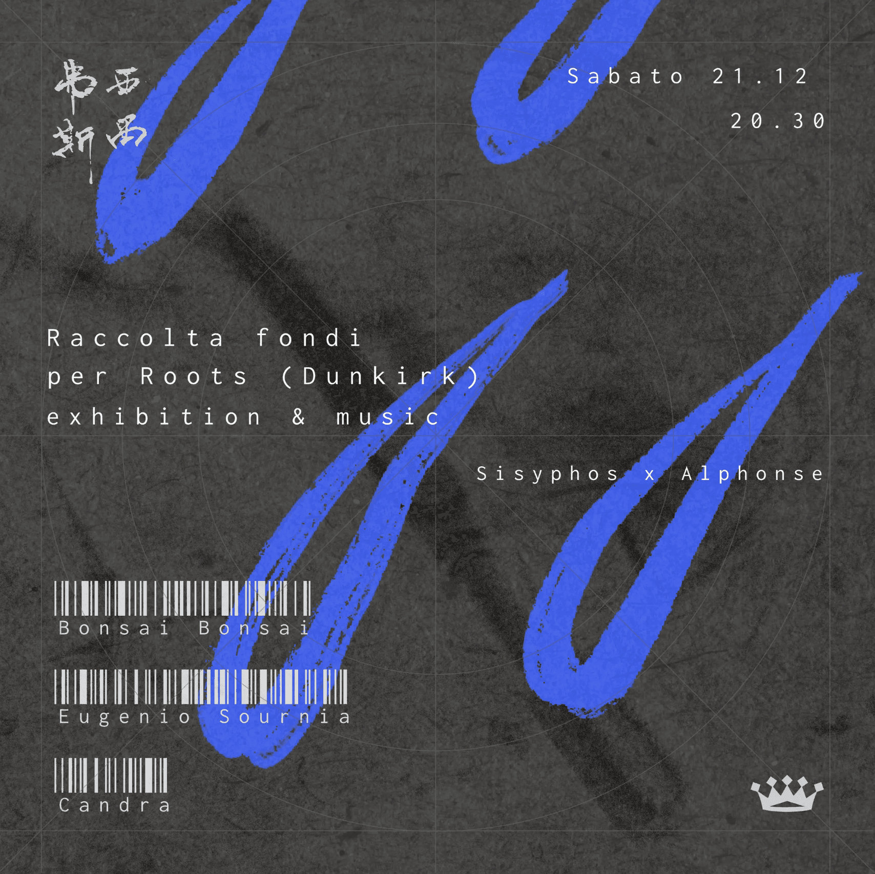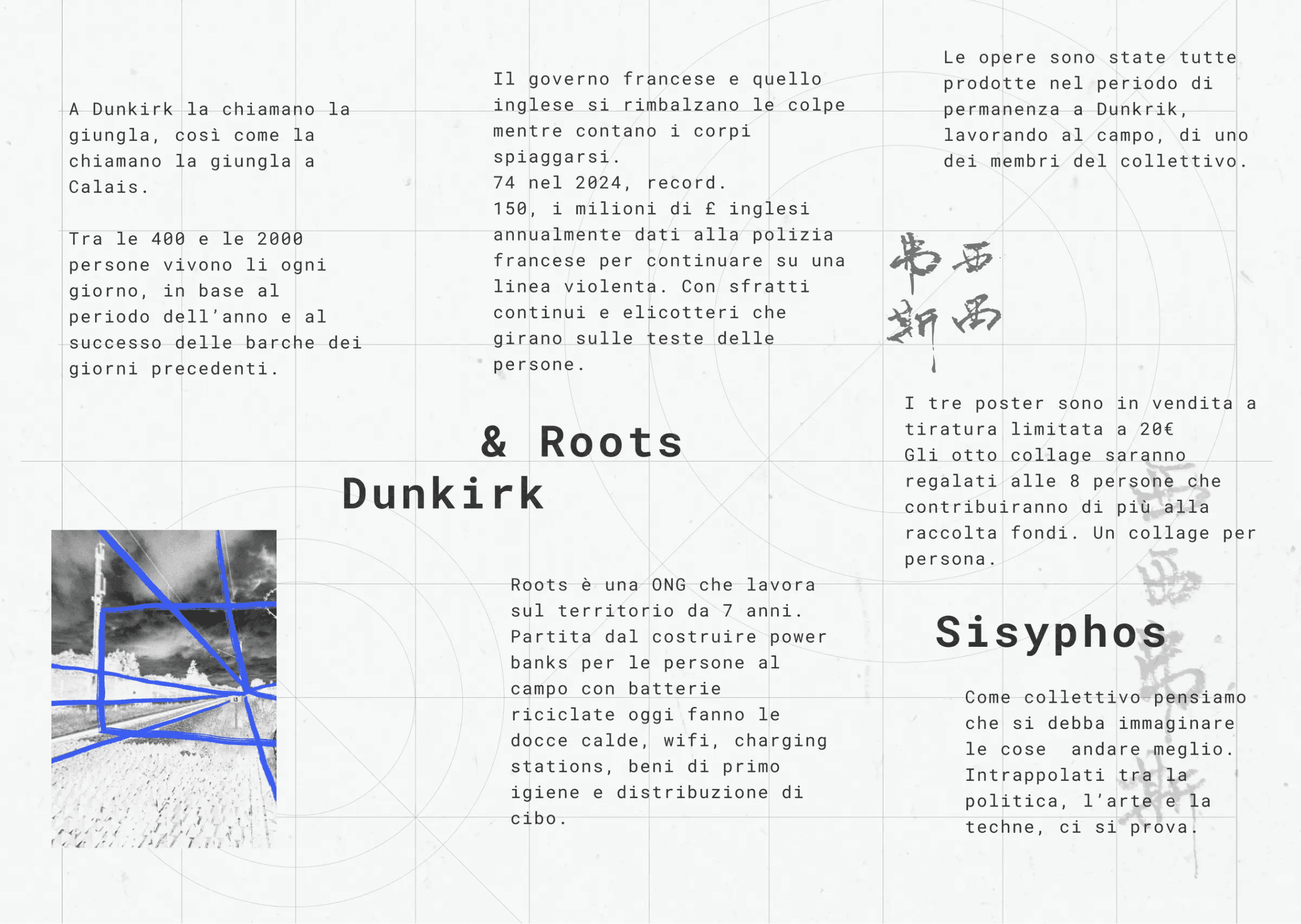 An event to raise funds for Roots, an organisation that supports refugees in transit near Dunkirk with essential services: internet access, hot showers, distribution of basic supplies, and food.